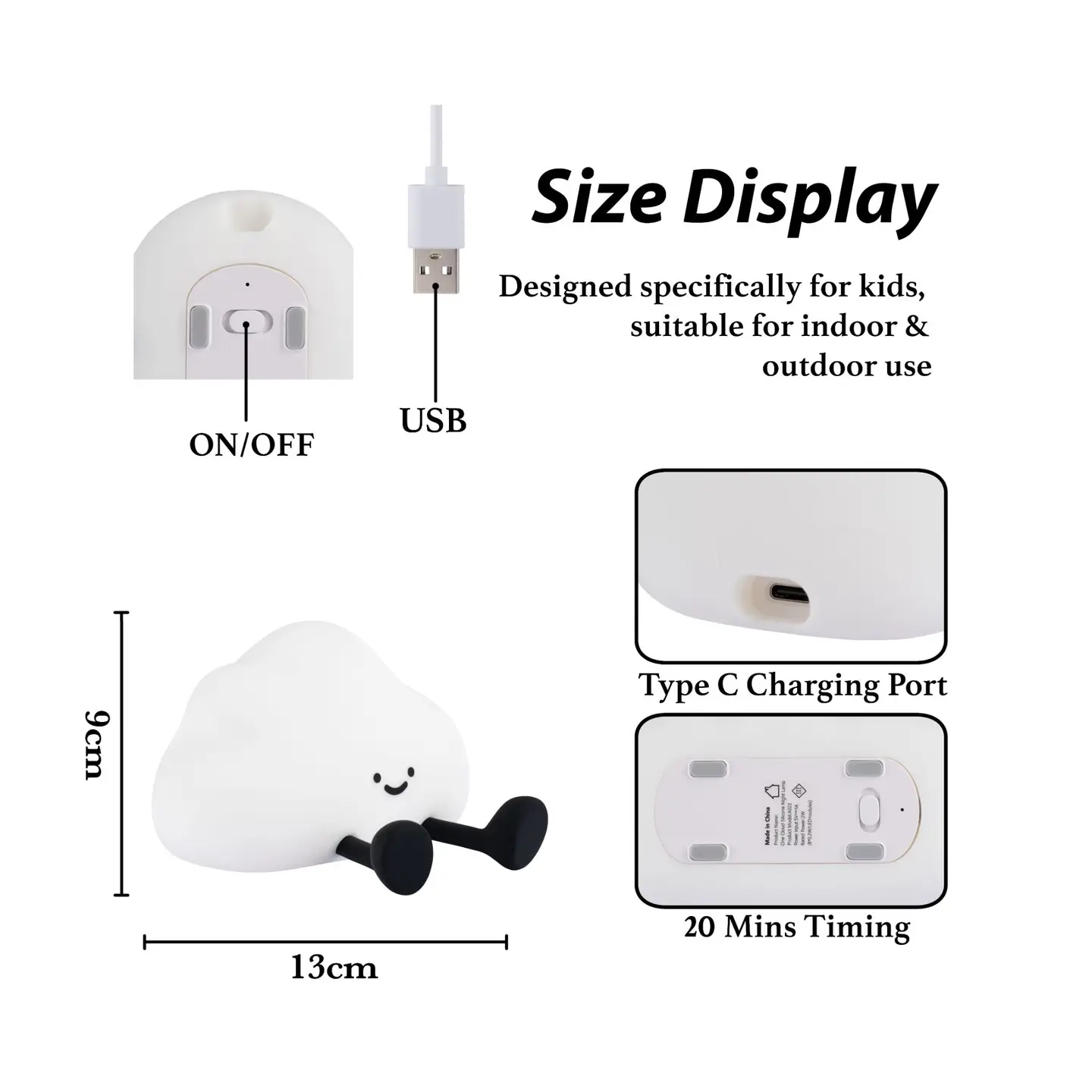 * Cute and Functional: The kids’ cute cloud nightlight combines an adorable design with soft, soothing light, making it a perfect companion for kids at bedtime. * Convenient Timer Function: The Soft Light Timer Lights feature a built-in timer, allowing you to set the duration of the light.